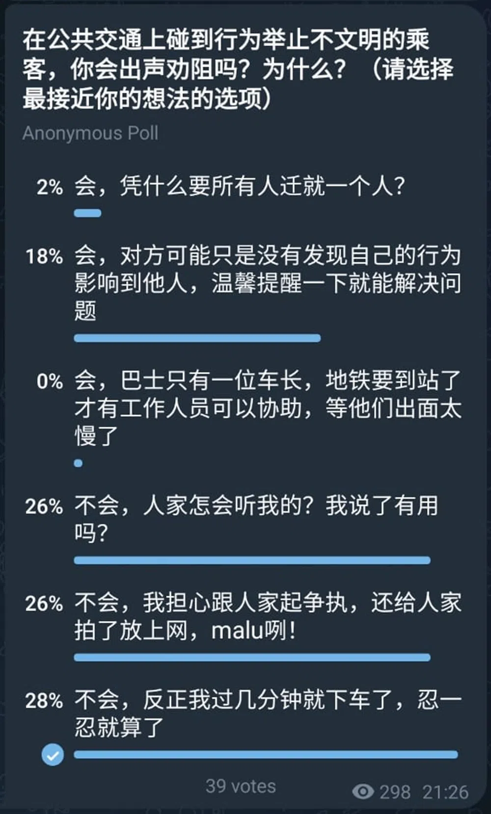 感谢39位蚁粉抽出宝贵时间作答,但必须指出的是,有80%表示不会劝阻行为举止不文明的乘客。