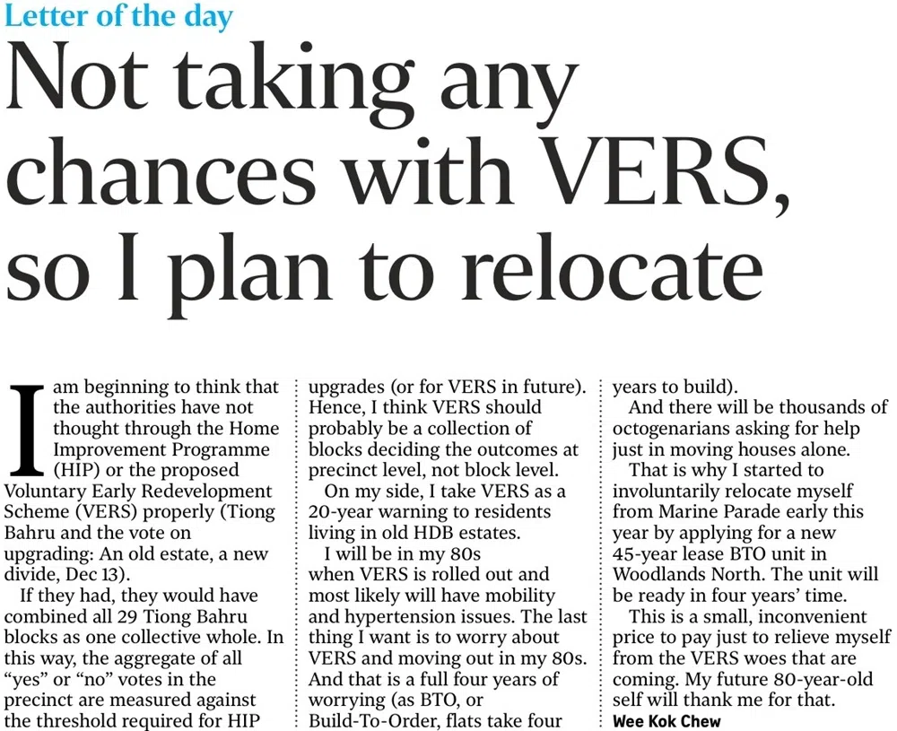 “VERS推出时,我已经80多岁了,很可能面对行动不便和高血压的问题。我在80多岁时,最不想担心VERS和搬家的事情...... 所以,我在今年初开始非自愿搬离马林百列,申购兀兰北45年屋契的预购组屋,四年后会建好。这是我为了避免VERS所引起的烦恼而付出的微小但麻烦的代价。未来80岁的我会感谢自己。”