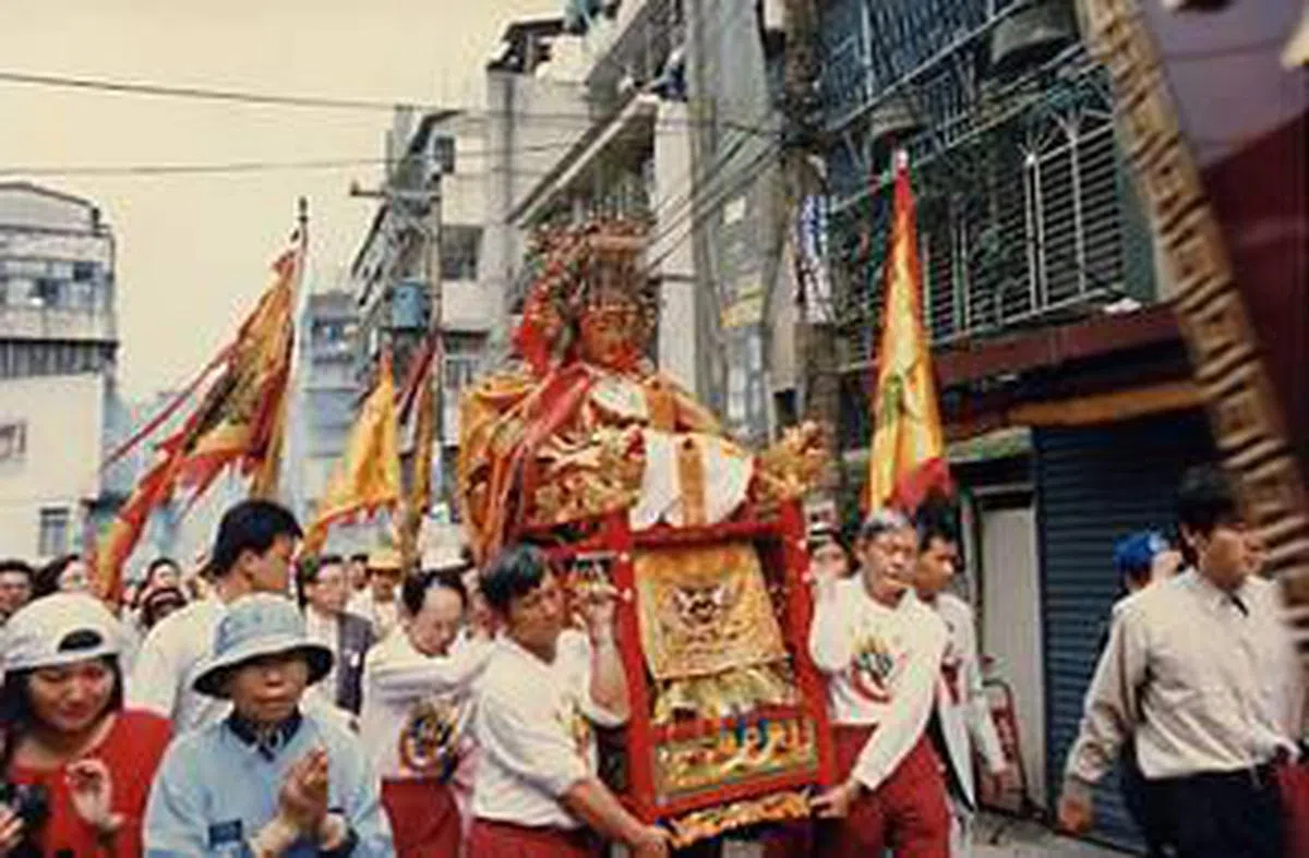 巡游花车上坐着的虽然是湄洲妈祖,扩音器里大声播放着的却是台湾街头年轻盲人歌手徐承邦演唱的台语歌曲《妈祖的囝仔》(妈祖的孩子)。