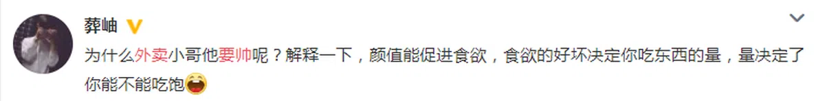 好些顾客在订餐时就备注,希望送餐的是个帅哥或是美女,反正就是要颜值高的。还有网友为此做出解释,称见到帅哥或是美女心情会好,这样才能够促进食欲,才能吃得饱: