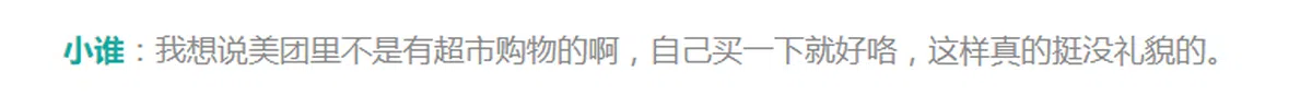 有网友就称,明明自己买一下就好,却选择叫外卖小哥做不属于工作范畴内的事。这样很没礼貌,明显就是在占人家便宜: