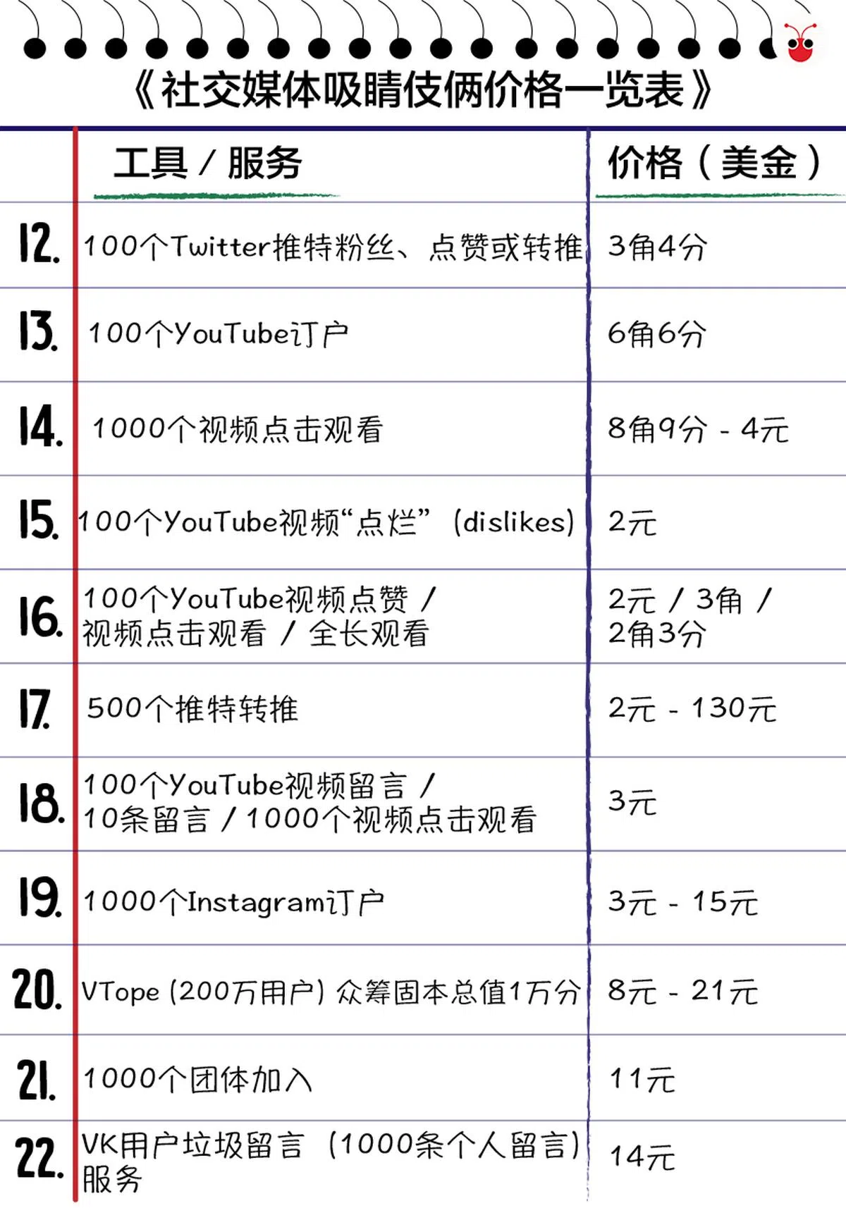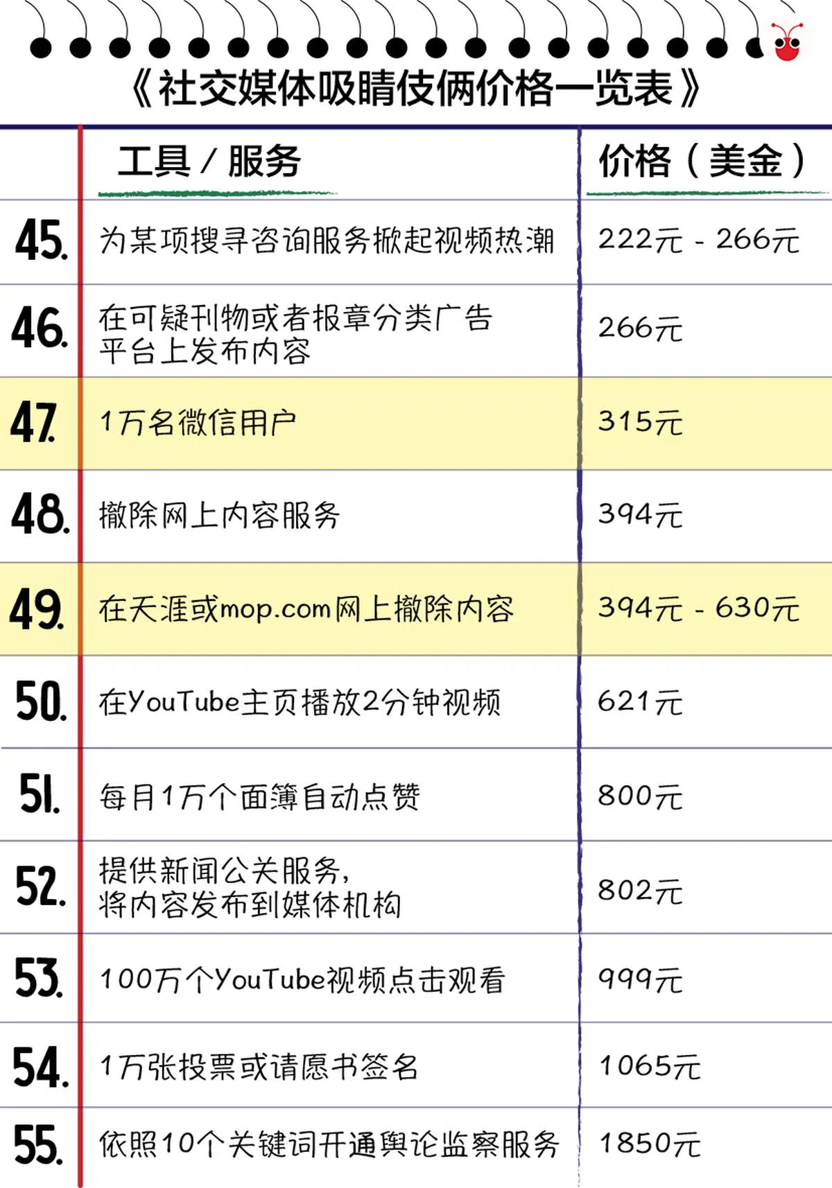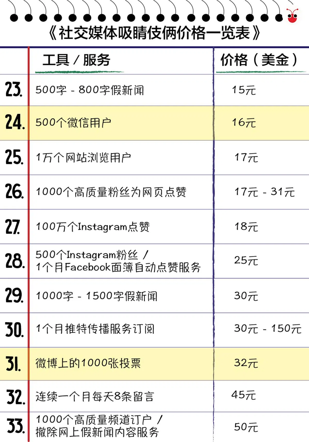国会特选委员会昨天发布的279页报告,看得红蚂蚁疲惫不堪的眼睛直发酸,突然在一堆干干硬硬的资料当中,发现了令人眼前一亮的价码一览表,清楚列明当今社交媒体平台上,搞促销、博出位、买粉丝、增加点击、制造假新闻的明码标价。
