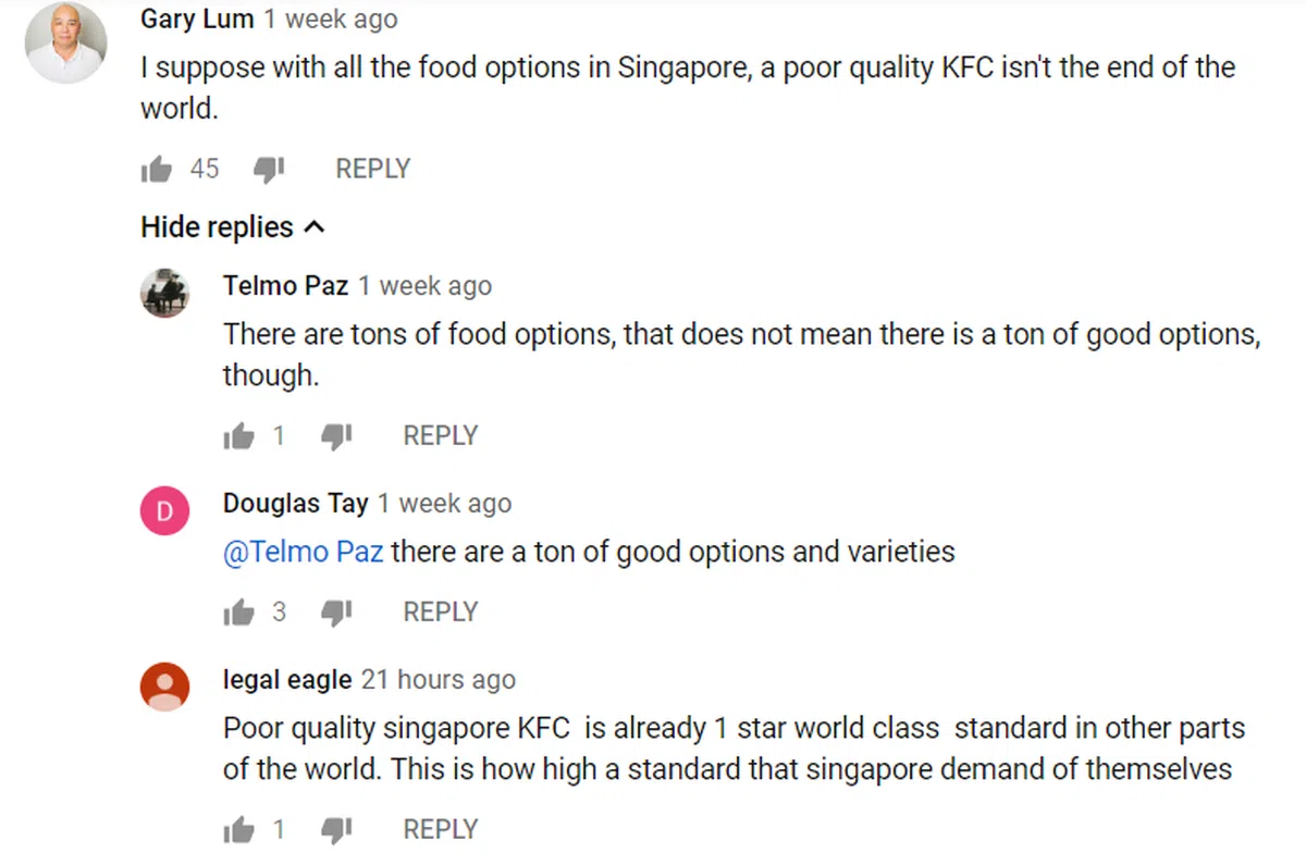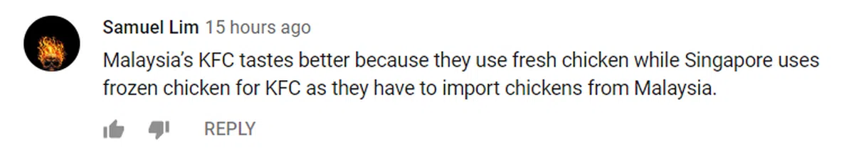 虽然Greg在视频中没有拿新马炸鸡来做一对一比较,只是说新加坡的原味炸鸡和蘑菇鸡肉汉堡超难吃,另一方面却又说黄金香料炸鸡和烤鸡腿好吃得不得了,二比二打成平手,但网民们就没有他那么委婉,直接总结出新加坡肯德基在味道和口感上比不上马来西亚,是因为鸡肉的来源。