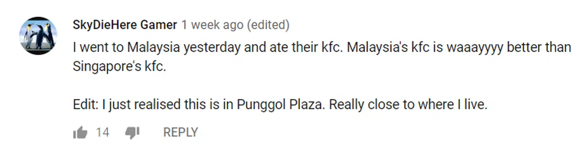 也有网民看了视频后说,他昨天刚去马来西亚吃了肯德基,马来西亚的肯德基比新加坡的好吃太太太太太多了。他还眼尖地发现Greg试吃肯德基的地点就在靠近他家的榜鹅生活聚场(Punggol Plaza)内。