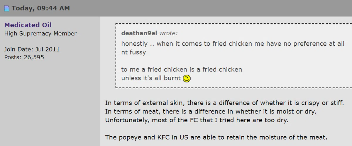 不过,只要是炸鸡,一吃进爱好美食又嘴刁的新马网民嘴里,就立即能在味道和口感上分出“天渊之别”,只不过大家都不太能说出“别”在哪里罢了。