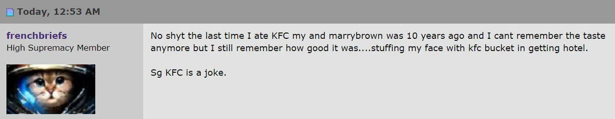 这个视频在2019年的第一天被挂上本地的论坛网站“饮食男女”(Eat Drink Man Woman)后,掀起热议。有网民说:和马来西亚的肯德基比起来,新加坡的肯德基简直“是个笑话”(is a joke)。