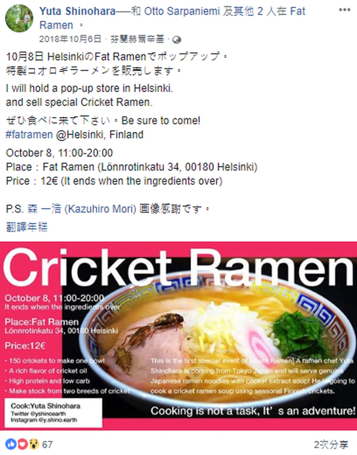 自称食用昆虫传道士的筱原,也研发出独一无二的蟋蟀拉面。他用料天然而且不吝啬,不止用干燥蟋蟀熬汤底,每碗面还用了约100只小蟋蟀,在自己开的餐厅里售价一千日元(只约新币12.36元)。据说,吃起来味道像虾,已有七千人挑战过,而且目前无负评。
