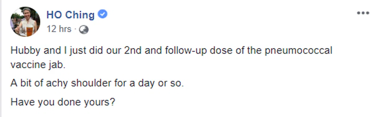 继许文远部长昨天分享防跌“四步骤”之后,李显龙总理夫人何晶今早也在面簿上分享她和老公的“打针记”。