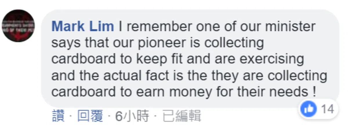 下面这位则忆起2015年曾有部长称,老人只是把捡纸皮当做运动,但事实上捡纸皮真的是他们的谋生之道。毕竟,如果不愁温饱,会有几个人为了锻炼身体而在太阳下干这种事?