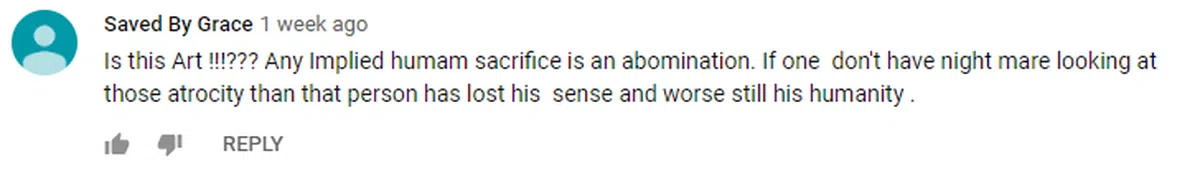 这是艺术吗!!!???任何暗示人祭(的作品)都是令人厌恶的。如果一个人看过这些恐怖的东西后不做恶梦,那他就失去自我、甚至毫无人性了。