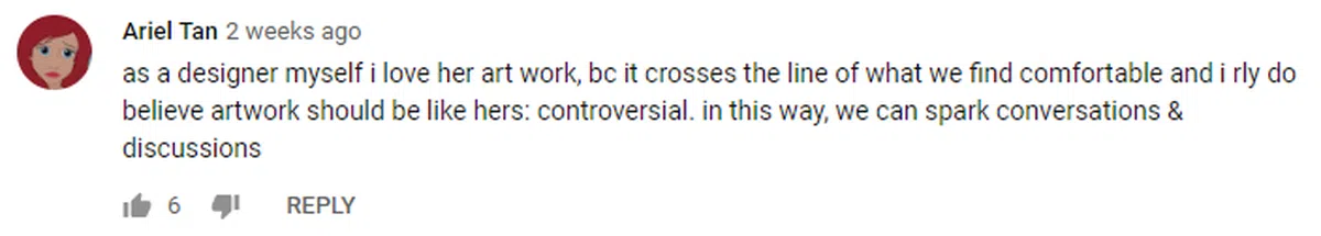 自从林琪璇开始发表这一系列的作品,观众便持有正反两极评价,也毫不拘谨地表达自己的想法。即使最近亚洲新闻台采访了她、请她介绍自己的艺术品,还是有不少网民在视频底下留言,表示不满。