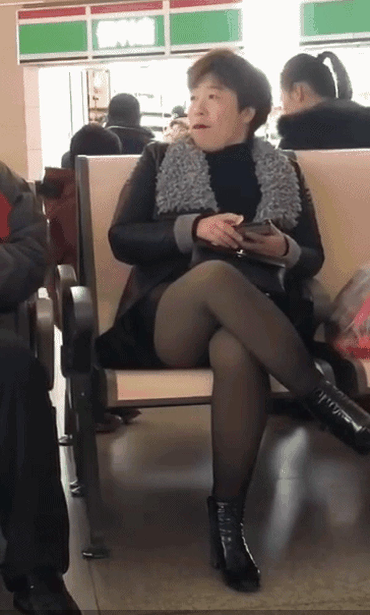左边那两张图可并不是影帝黄渤女扮男装坐在机场拍戏哦,而是候车室里的一名大妈。可是这个大妈左看右看根本就是涂了唇膏、穿了丝袜和皮靴版的女版黄渤,完全可以以假乱真~