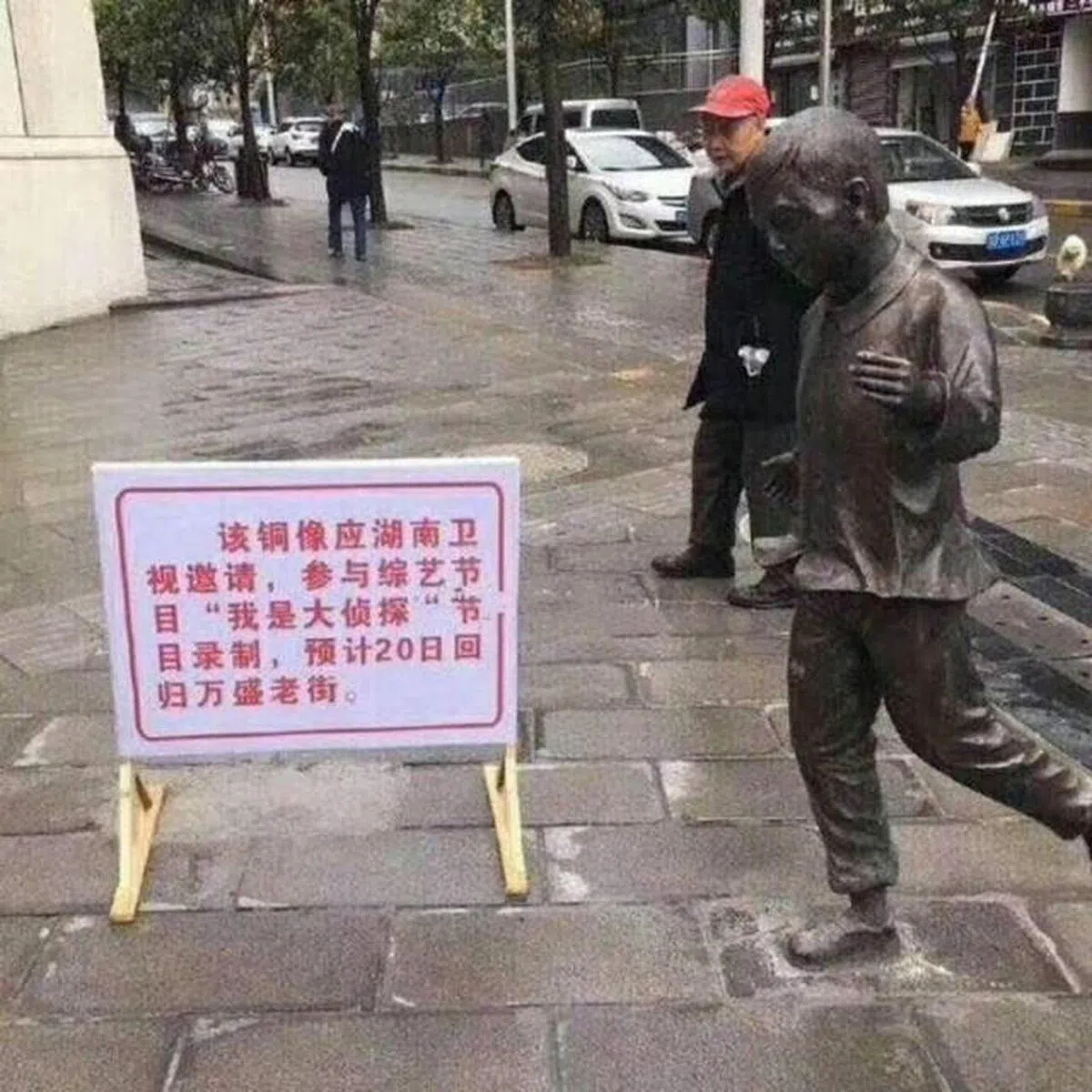 谁知道几个月后雕像居然从街上消失了,而雕像原址的说明简直让人羡慕嫉妒恨。原来这尊雕像还“出人头地”,跑起了通告。