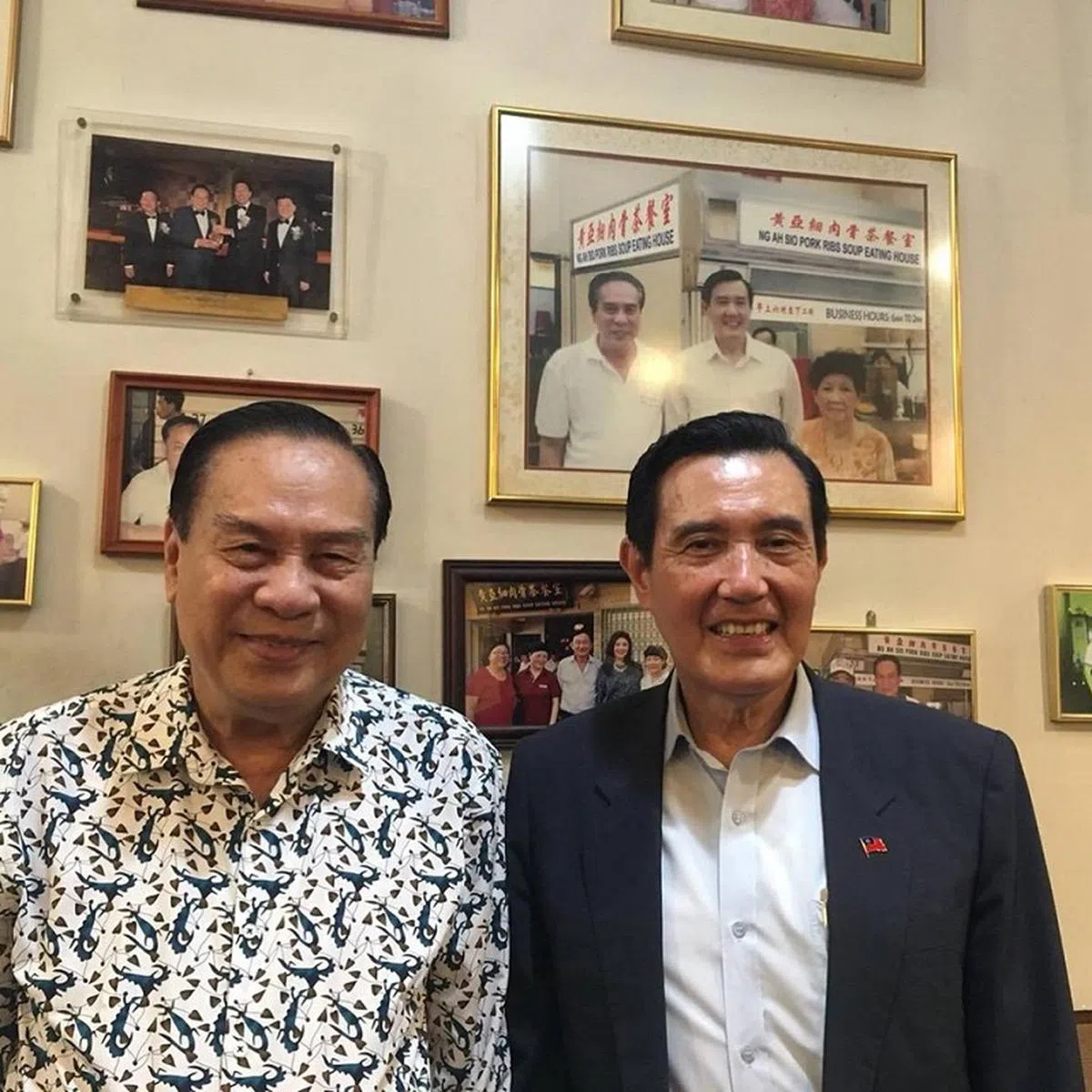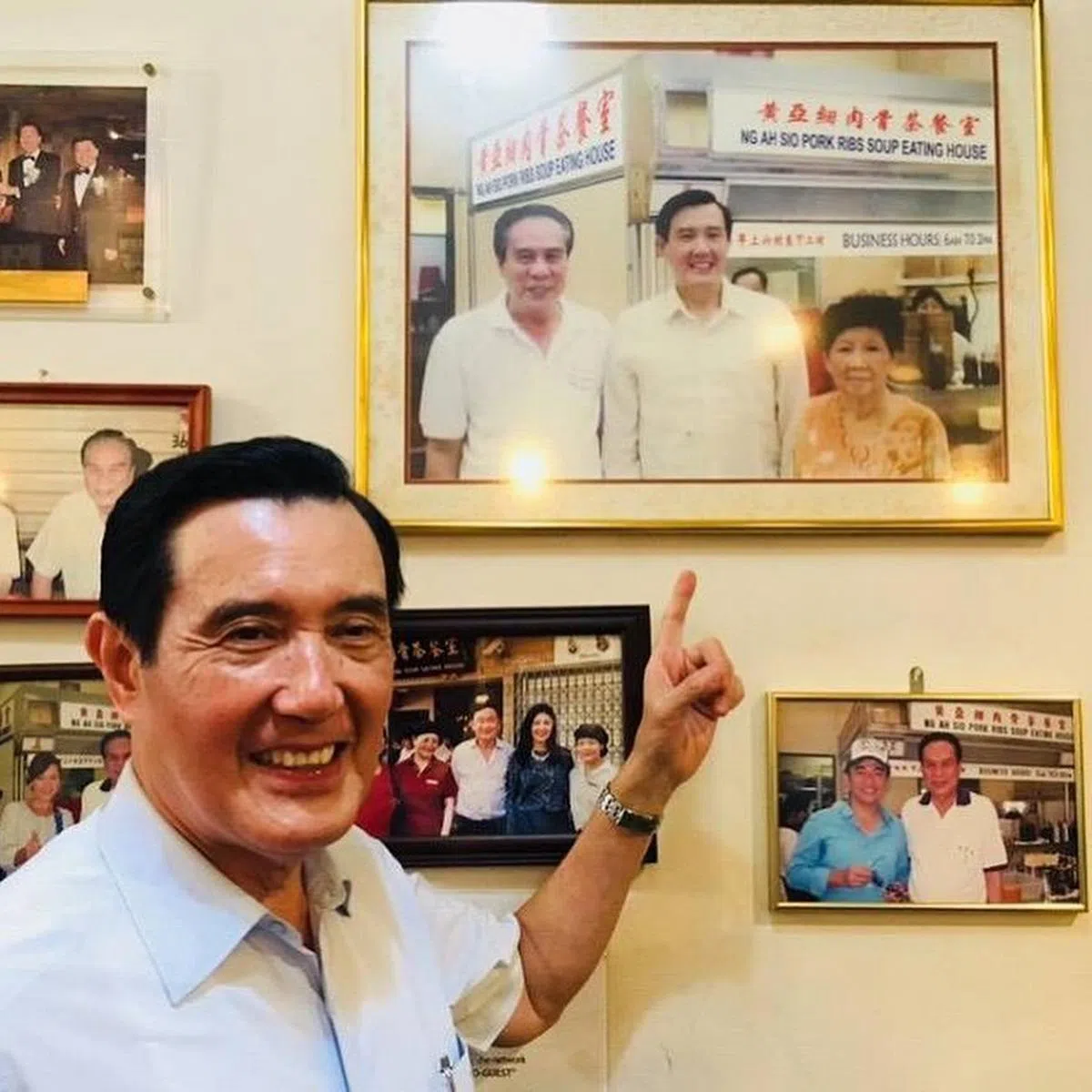挂在墙上的这张合照是在2006年5月7日拍下的,那天是马英九第一次尝试肉骨茶,还和老板黄亚细夫妇拍照留念。