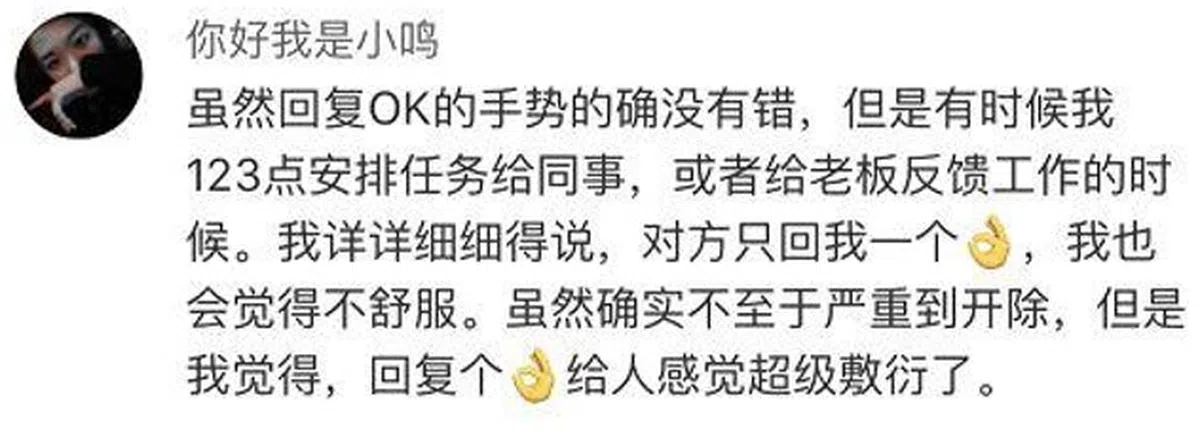 除了回复“OK”手势,也有一名网民因回复了“嗯”而换来上司的批评。