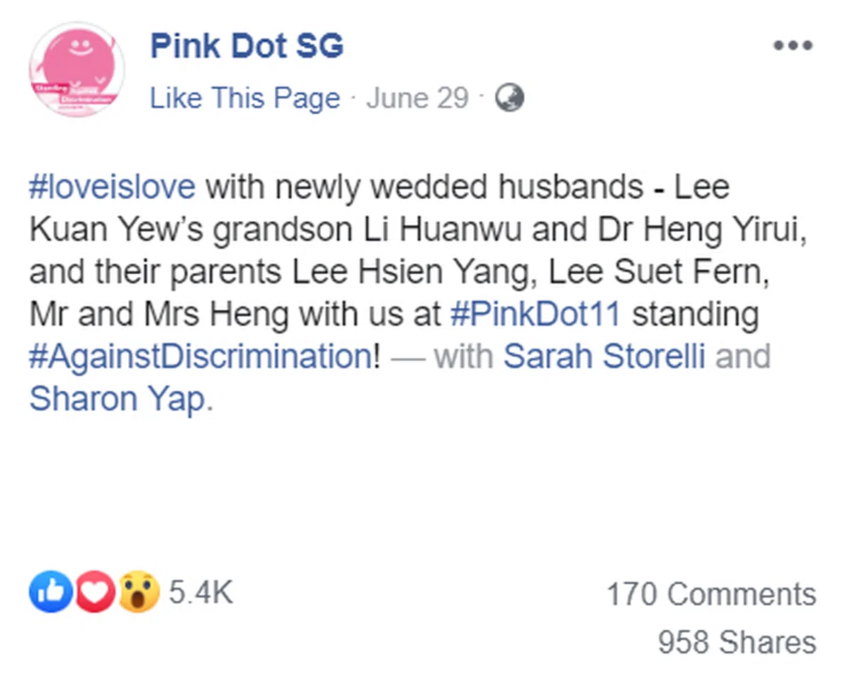 看到了吗?那张“粉红照”照片在Pink Dot SG 面簿账号上截止今天下午收获5400多个表情包和近1000个分享,可以说完胜李显龙总理的“跑男照”。那张“跑男照”只拿下3000多个表情包和近300个分享。