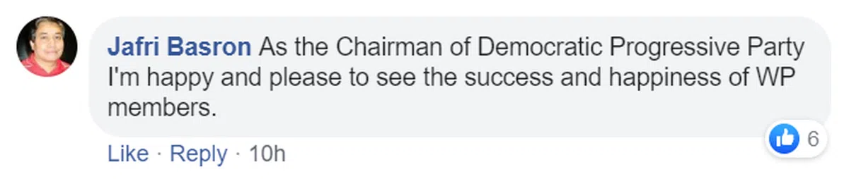 “身为民主进步党的主席,我很高兴看到工人党党员如此成功与快乐。”