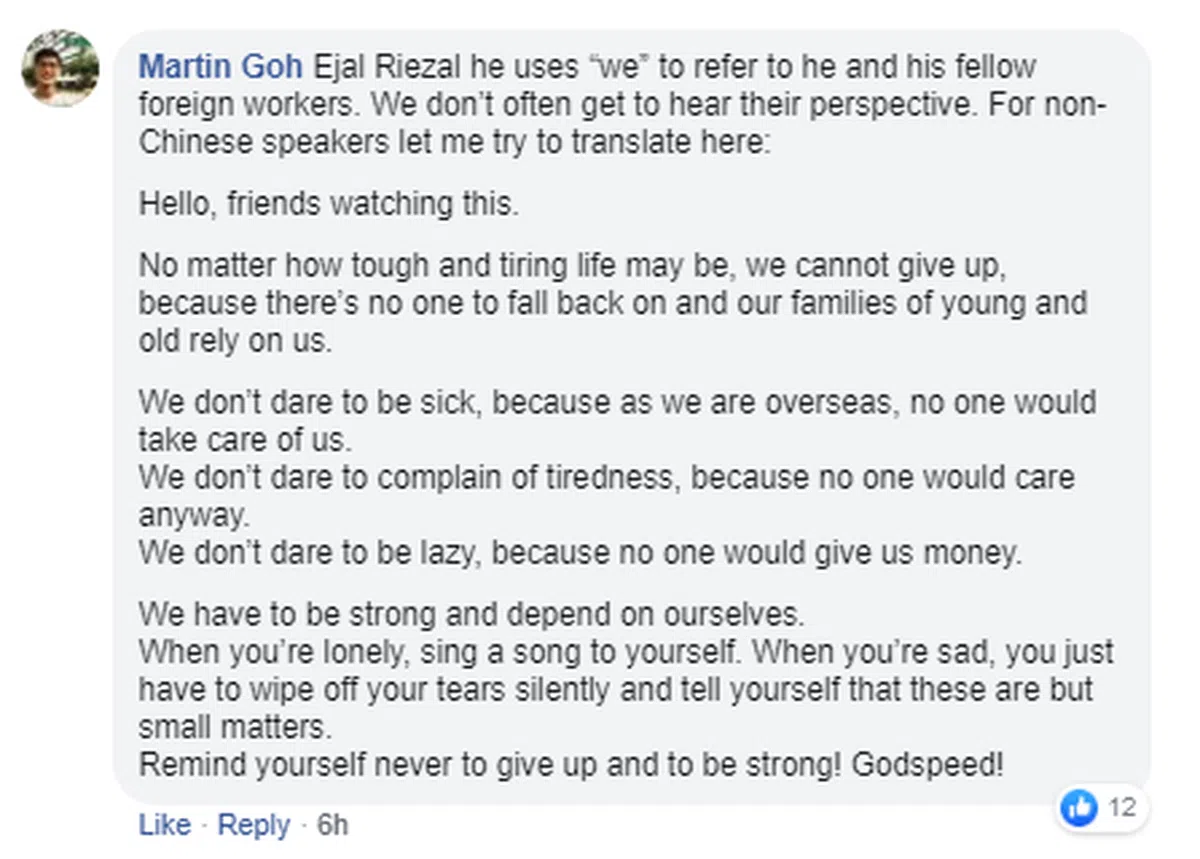 有网民觉得很少从外劳口中听到他们的“心酸”,决定把老哥的话翻译成英文版(而且还译得相当传神到位),让更多人能关注并体谅到这些外籍劳工的不易。