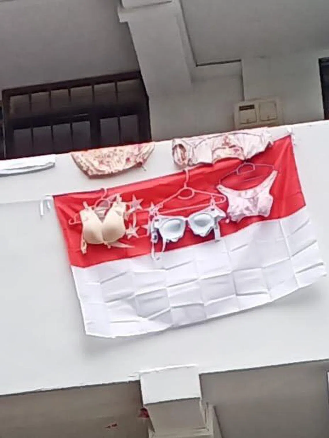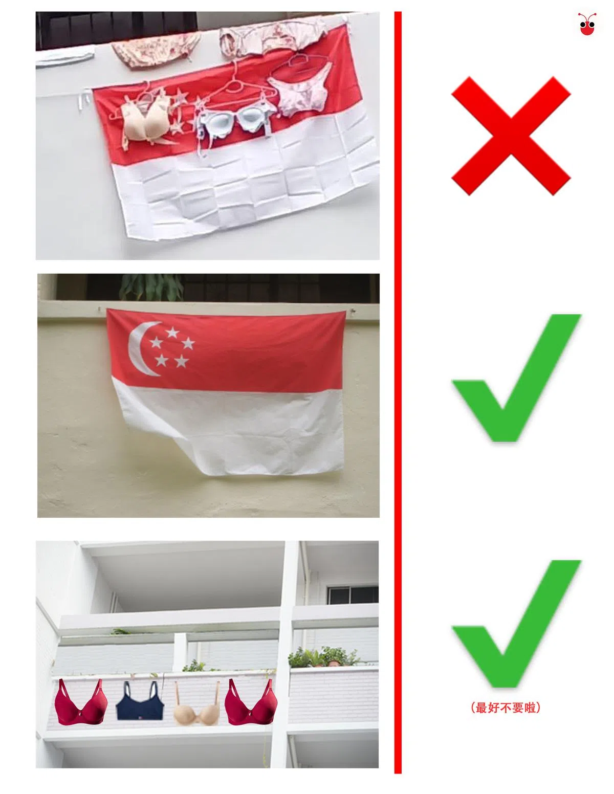 太辣眼睛了,这是谁干的?“一面国旗+三件内衣”的照片今天在面簿上疯传,引起网民议论纷纷。有人胡乱猜测那三件内衣的尺寸,有人说“这样新加坡会走霉运”,有人猜测是blur blur的新移民所为,有人说照片背后的意思是“新加坡需要6盏明灯驱走霉运”。新加坡国庆日是8月9日,一般民众只能在7月1日至9月30日张挂国旗。内衣裤不用说,大家天天都穿。红蚂蚁在这里给你做个示范,教你怎么挂内衣和国旗。