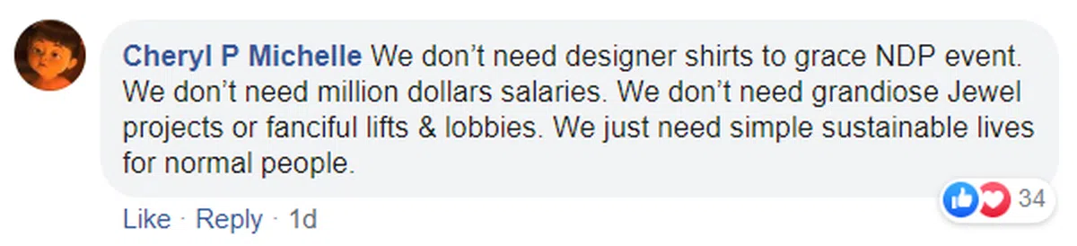 “我们不需要穿上名家设计的上衣出席国庆庆典。我们也不需要百万年薪。我们不需要大气的星耀樟宜项目,或者装饰豪华的电梯和大堂。我们只需要让普通人能够简单可持续的生活下去。”