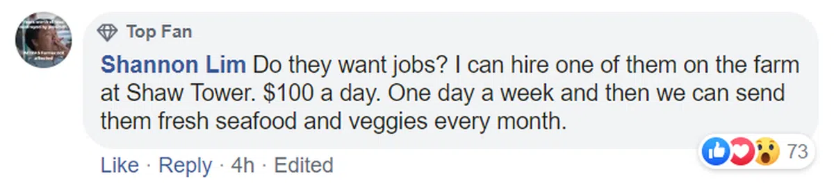 也有网民留言说,如果这对老夫妇缺钱需要工作,她想聘请其中一人到她位于邵氏大厦的农场工作。一星期一天,一天100元。每个月还能供应新鲜的海鲜和蔬果给他们。