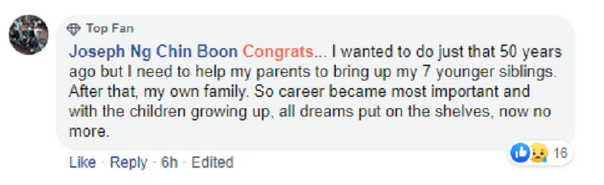50年前他也想这么做,但要帮忙父母分担照顾七个弟妹,接着又到照顾自己的家庭,工作对他来说是非常重要得。随着孩子慢慢长大,梦想也不了了之。