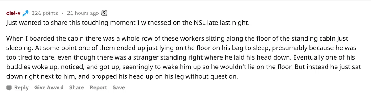 “只是想跟大家分享我昨晚在南北地铁线上目睹的感人一幕。 当我上车时,我看到一整排客工在车厢站立区的地板上坐着睡觉。后来,其中一名客工或许是真的累坏了,直接把包包当枕头卧地而眠,尽管在他头的旁边就站着一名乘客。最后,那名客工的一名伙伴醒了,看到正倒在地上睡着的他,便站起身走过去,似乎想去叫醒对方,这样他就不用再睡地上。没想到他却在已熟睡的伙伴身旁坐了下来,二话不说就把自己的大腿让出来给他当枕头。”