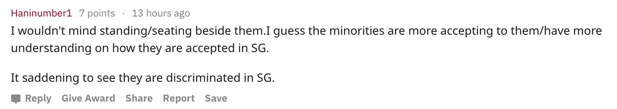 但也有网民表示自己一点都不介意与客工们站在一起或坐在一起。他们为弱势群体在新加坡遭到歧视,感到难过。
