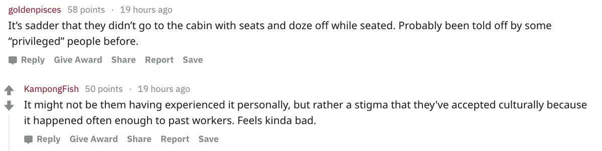 有些网民猜测,这些客工会不会是曾经被一些比较自以为是、不友善的乘客骂过,又或者是听过有客工被乘客排挤的故事后,就“习惯成自然”远离车厢座位。