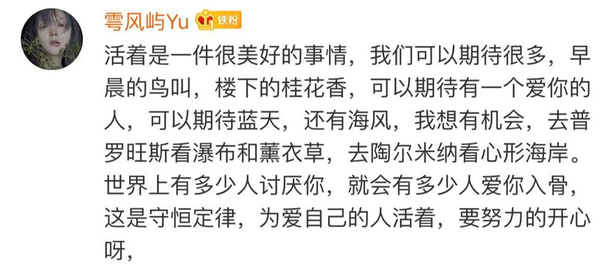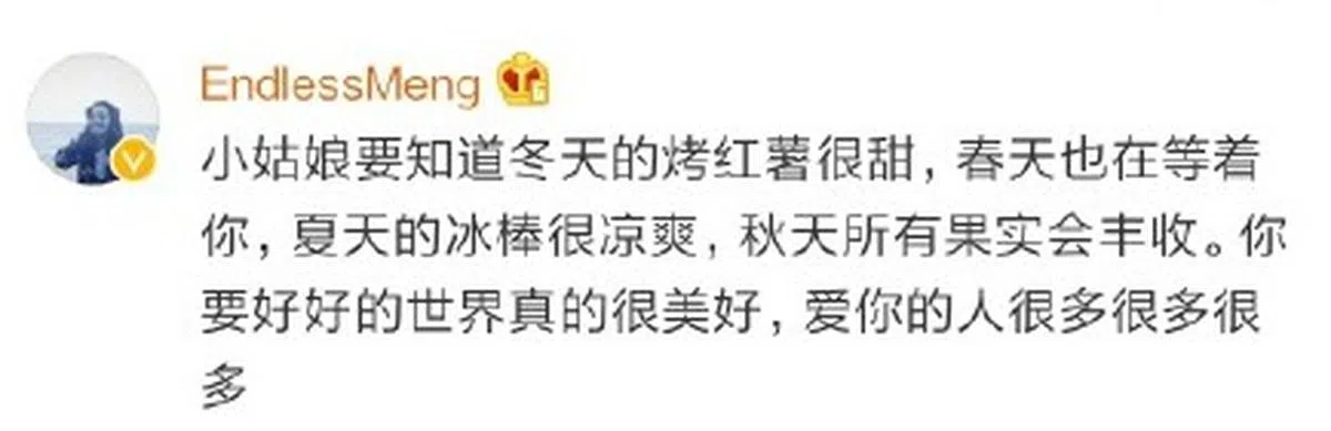 “冬天的烤红薯很甜,春天也在等着你,夏天的冰棒很凉爽,秋天所有果实会丰收。你要好好的,世界真的很美好,爱你的人很多很多很多。”
