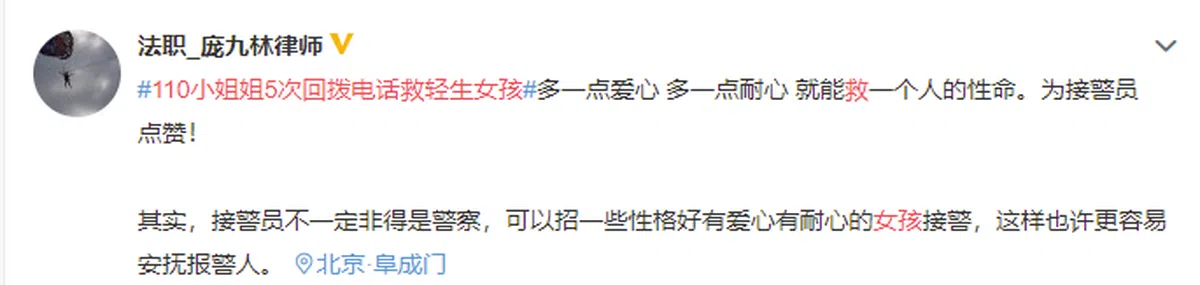 有网民表示,女孩在喝下农药后会打给警察,似乎也代表着她其实还有活下去的念头。也有网民大赞女接警员的行为,并表示警局可以多聘请一些有爱心的姑娘来接听报警电话,女性温柔声音比较具有安抚性。
