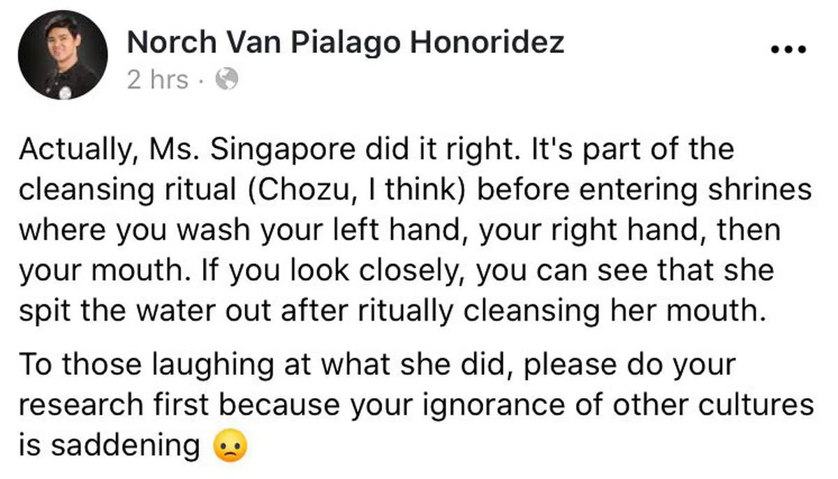 狮城美姐参拜日本神社时按规矩漱口,却遭菲国网民嘲笑“没脑”