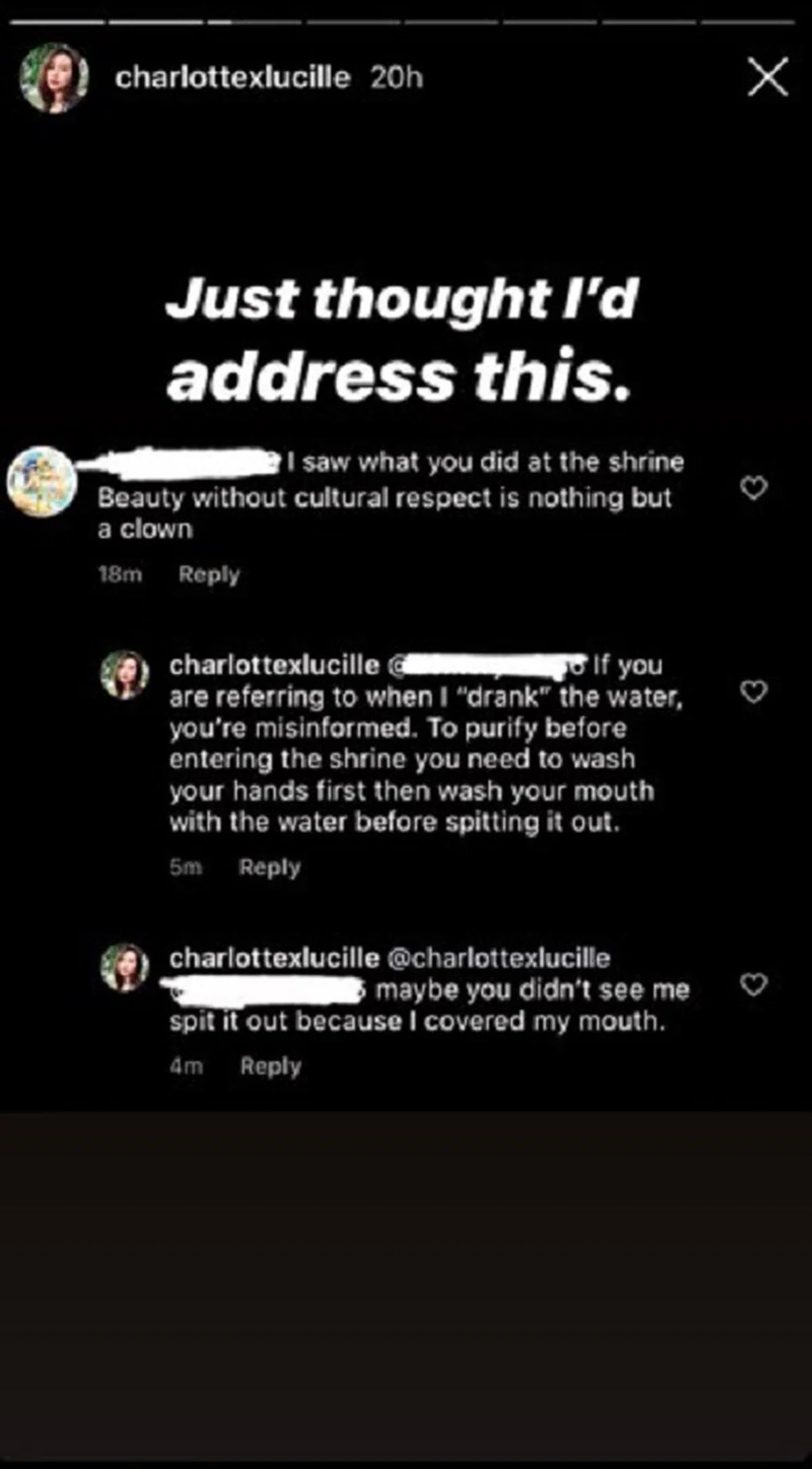 对此,狮城美姐在Instagram的限时动态淡定回应澄清说:“如果你指的是我‘喝水’一事的话,可能你误会了。进入神社前,是得先洗手,再清洗嘴巴,然后把水吐出来。”