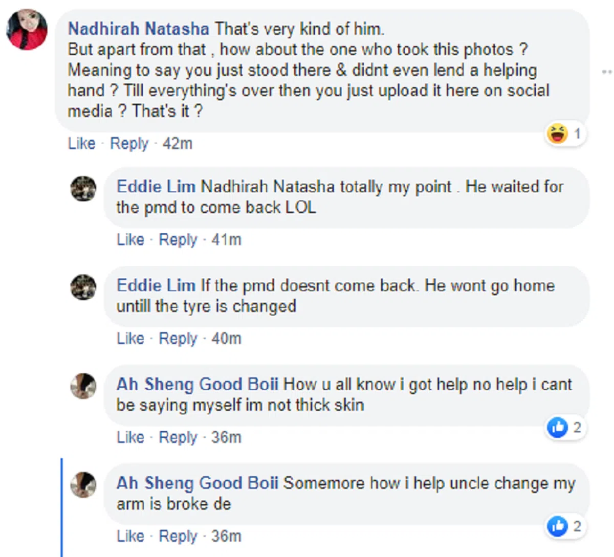 有相当多网民在看了帖文后质疑Ah Sheng Good Boii为何没有上前帮助德士司机,只是顾着站在旁边拍照。