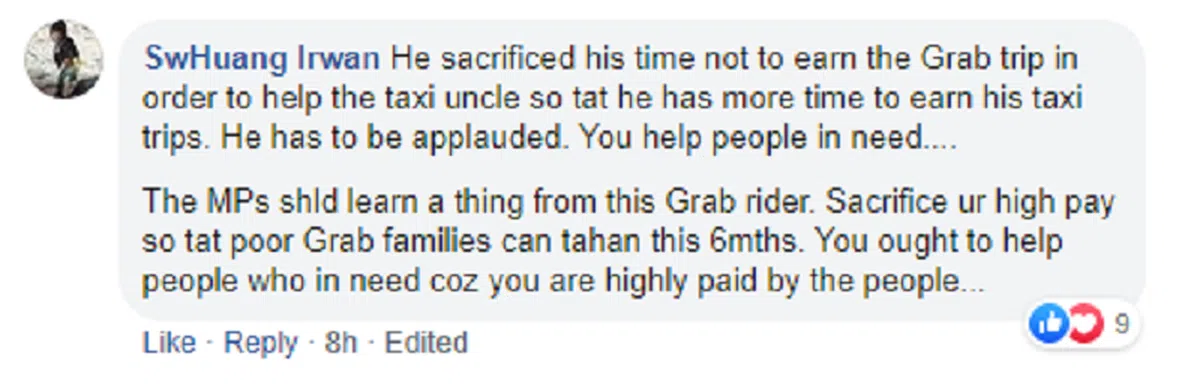 “今天凌晨1点,我看到一辆德士爆胎了,司机在现场找人帮忙指挥交通,因为他必须更换轮胎但没有人停下来帮忙。 这时,我看到一名 Grabfood骑士停下来跟司机大叔说:“Uncle,等我送完这个订单后,回来再帮你换轮胎。” 那名司机真的等着他回来帮忙换轮胎,而那名送餐员也真的遵守承诺回来帮司机更换车胎。毕竟那名司机年纪大了,没有力气自己换轮胎。”