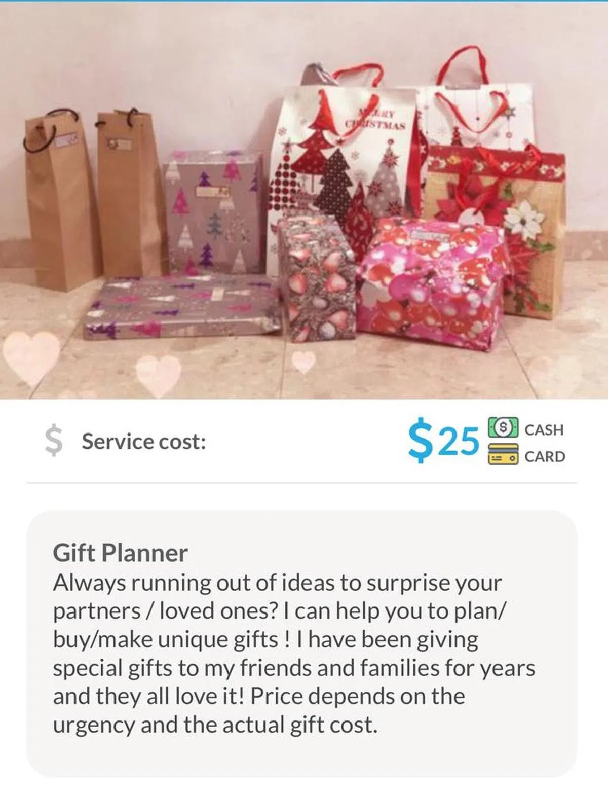 送礼物是件很麻烦的事吧?现在你不需要再想该送什么了,只要付25新元,你就可以将礼物这份重任交给对方,让他替你出谋划策(买礼物、做礼物等)。