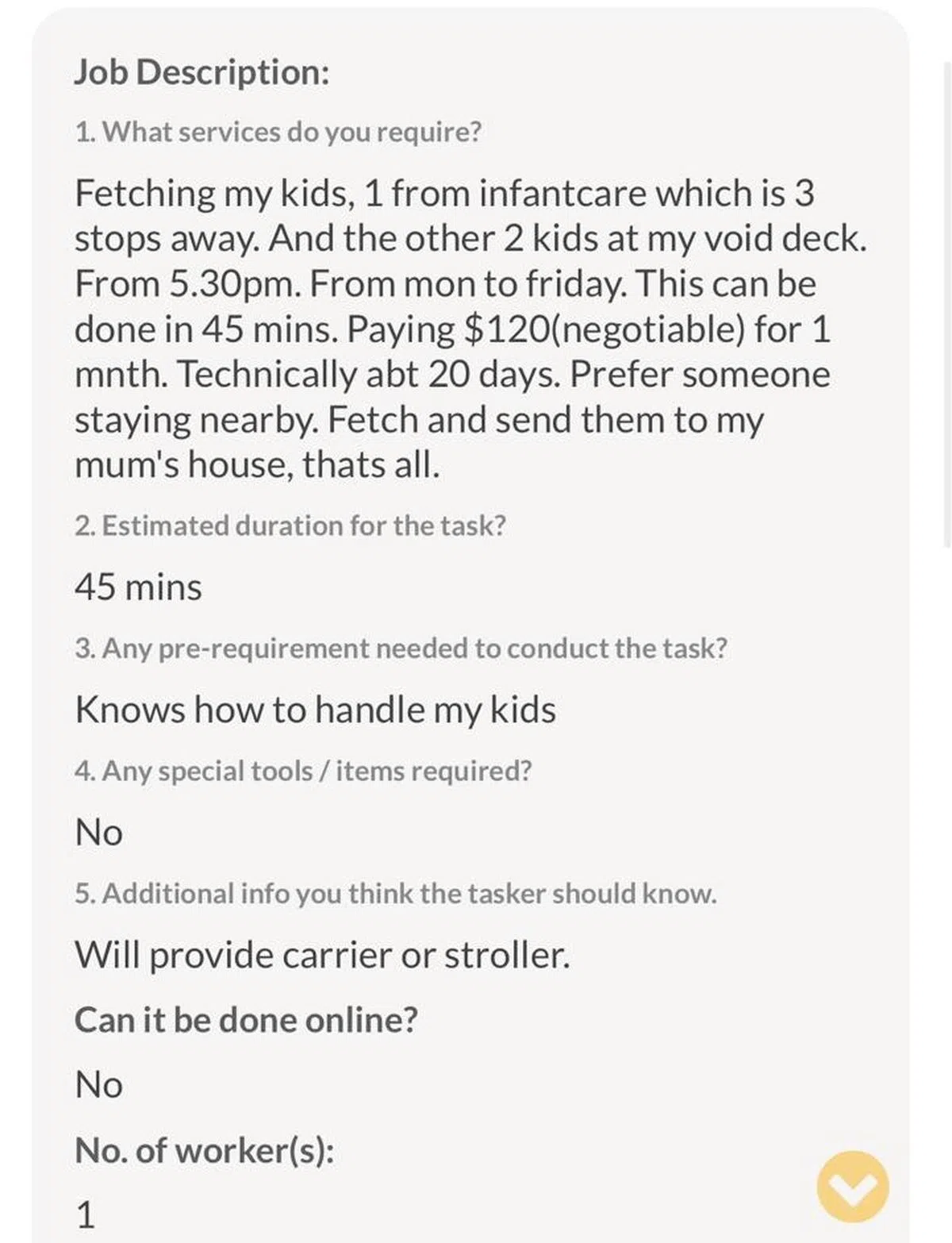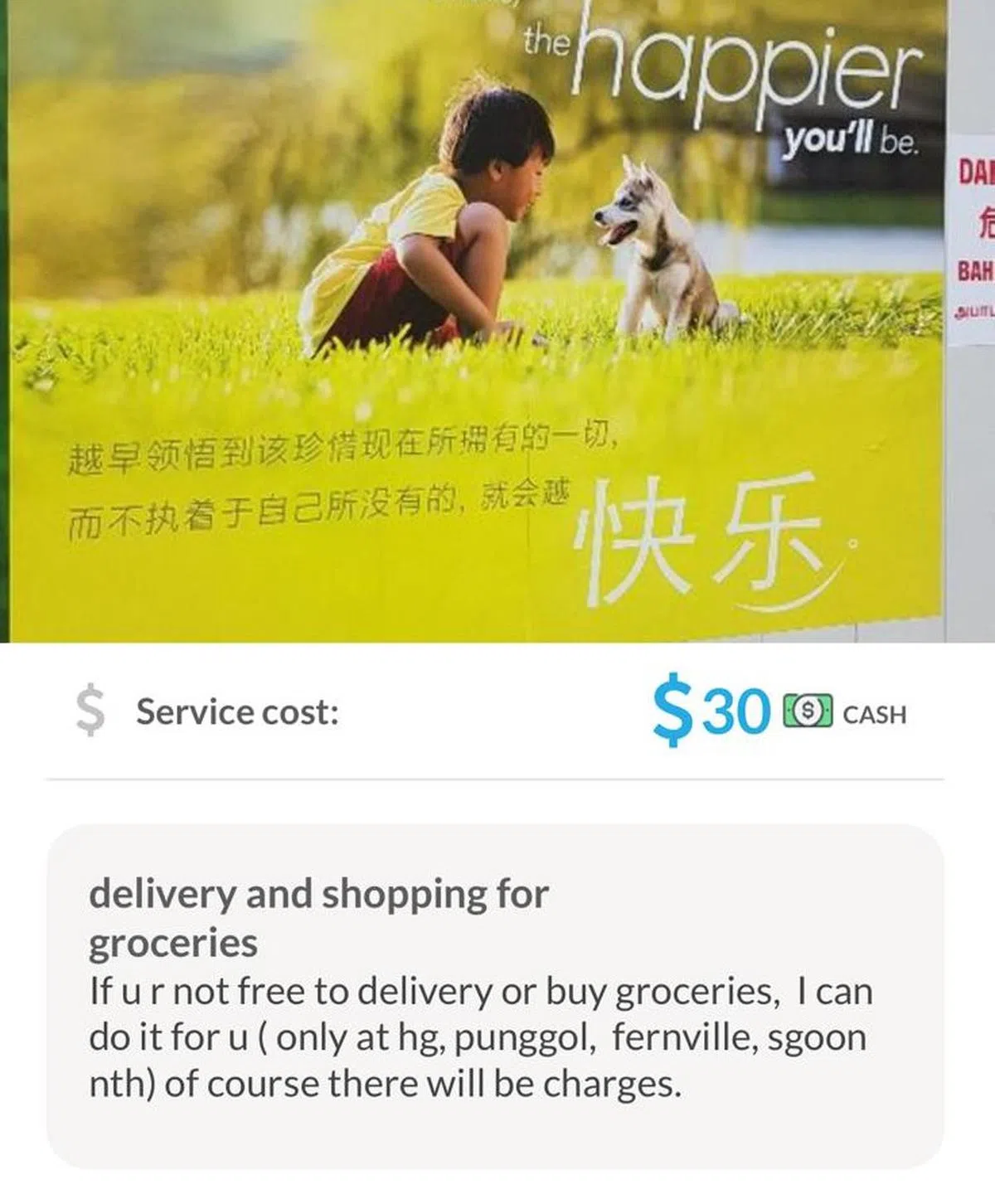 最多用户发布的帖子就是想邀请人帮忙跑腿,去超市买点柴米油盐酱醋茶等,这本来是件普通的事,毕竟新加坡每个邻里内至少都会有一间超市或是菜市场。(奇怪,现在很多柴米油盐酱醋茶都能网购还能送货上门,岂不是更便利吗?难道是想享受更人性化的服务吗?)