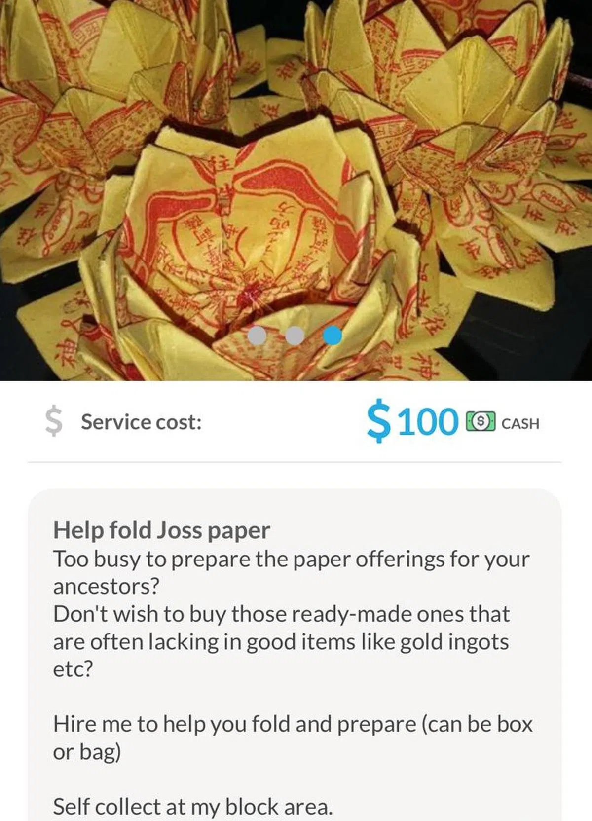 葬礼服务也不显得很新奇,只不过是在不同平台打广告而已。倒是折纸钱的,从小到大压根就没想过折纸钱这项技能也能够演变成赚外快的一种生意门路,真是太拼了。
