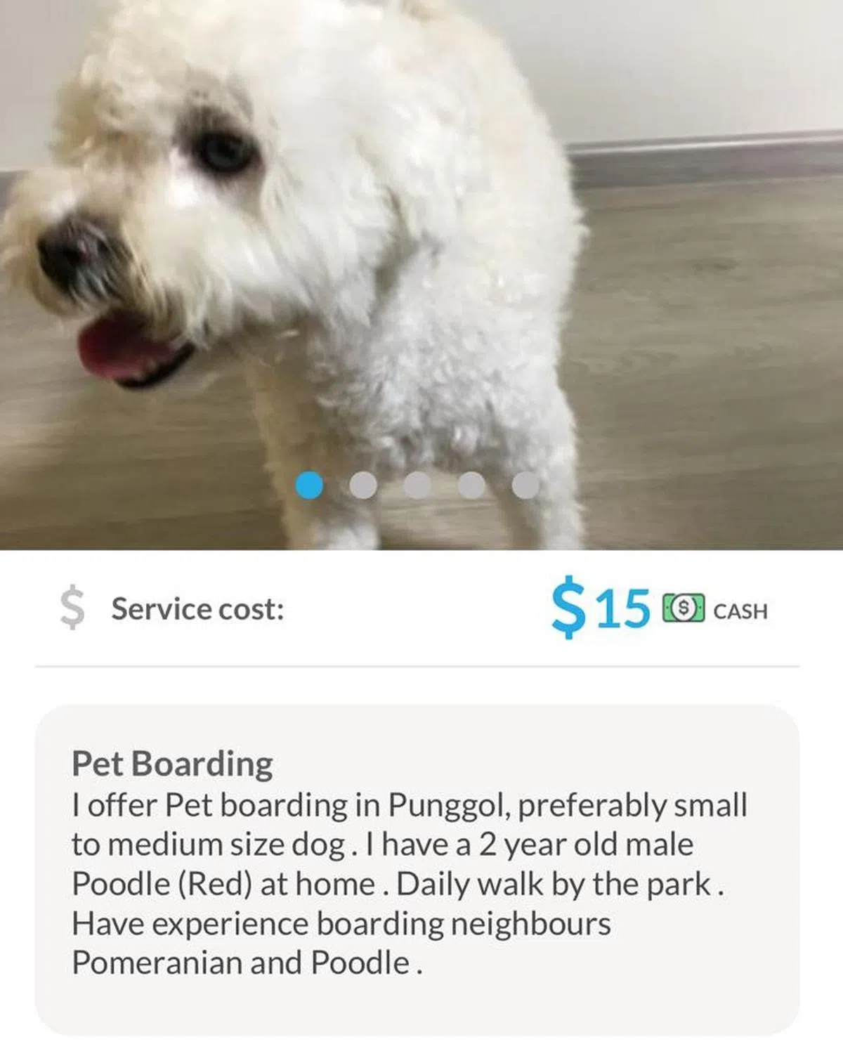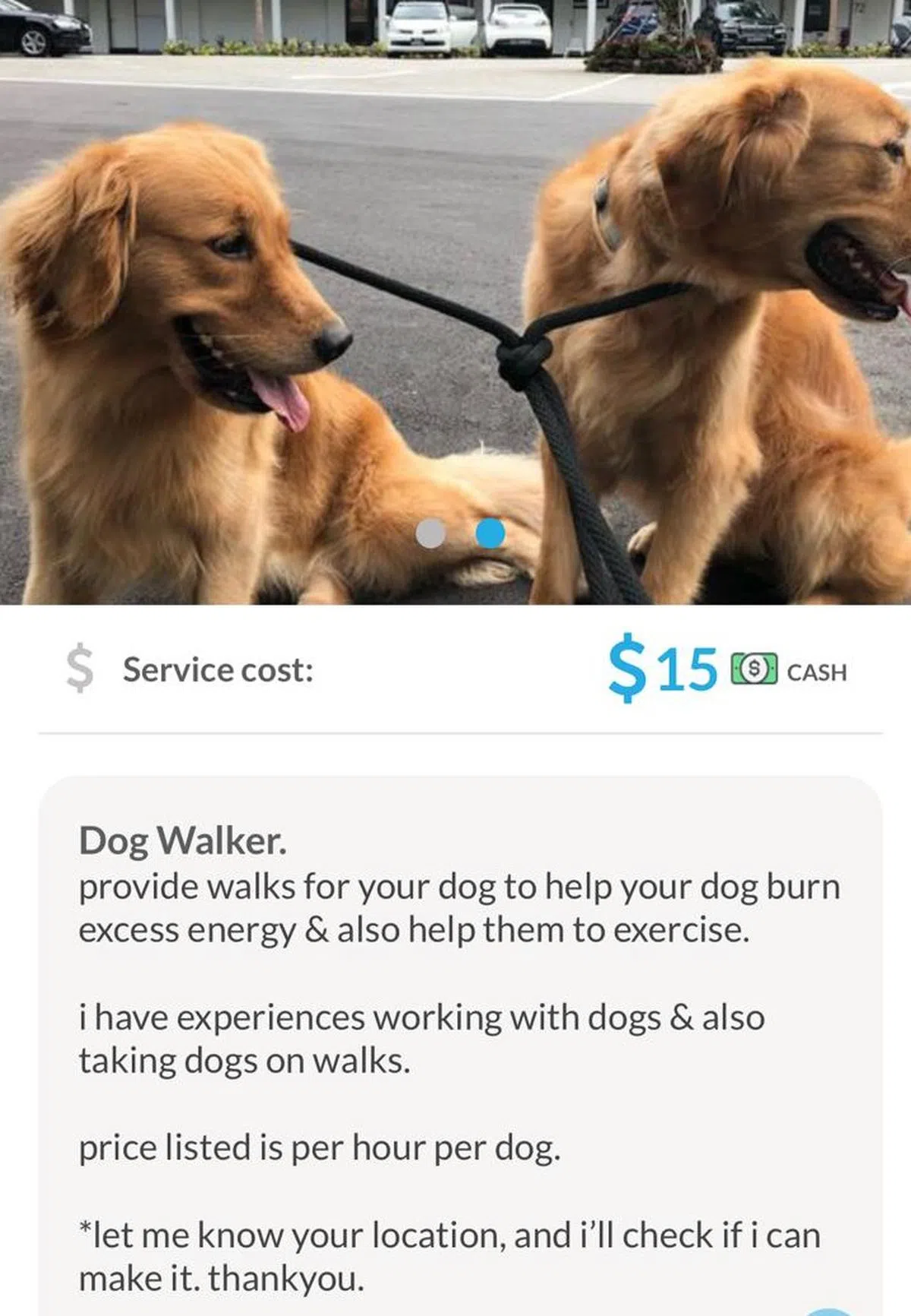 有商业头脑的用户就提供了这一项服务,并且表明自己在和狗狗相处这方面非常拿手,狗狗主人可以完全放心把宠物交给对方带出去散散步了。