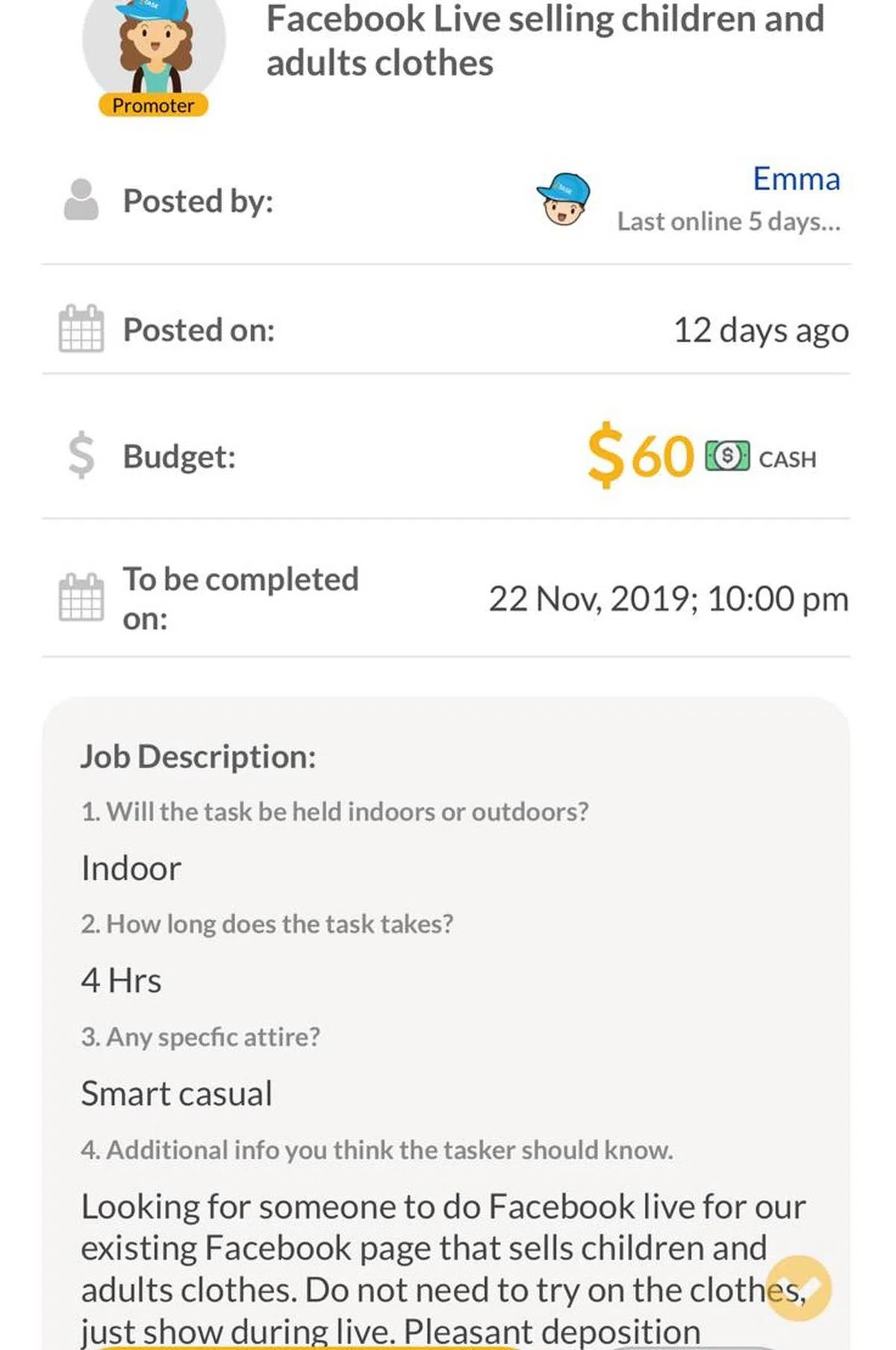 最近掀起了通过面簿直播做生意的风潮,用户之中也有人想做生意,但不想在直播上出境,因此想要聘请他人来当直播主持人,推销成人和儿童装。