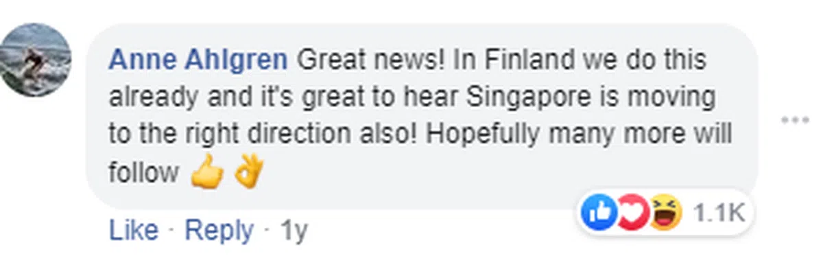 “在芬兰我们已经这样做了,很高兴听到新加坡也在朝着正确的方向前进!希望更多人会效仿。”