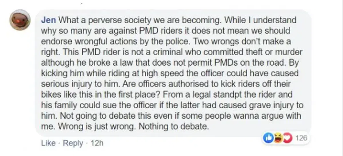 “我们的社会竟变得如此丧心病狂。尽管我理解为什么大家不喜欢电板车骑士,但不代表我们可以放任‘警察’错误的行为。即使电板车骑士先犯错,并不代表稽查员可以用过分的方式去对待他。” “...稽查人员难道就有权利将人从电板车上踢下来吗?从法律上来讲,如果电板车骑士受伤或出意外的话,是可以追究稽查员的。我不会去争辩这件事情的对错,因为错就是错,没什么好商量的。”