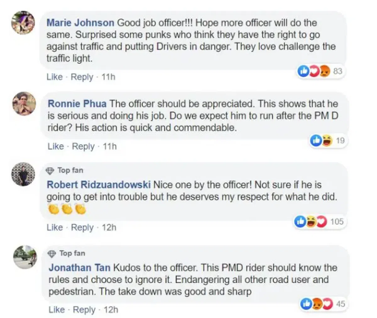 另一边,网民则极力支持稽查人员的处理方式,认为部分电板车就是害群之马,速度飞快无法无天,根本就不在意针对电板车所新推出的限制令。像这类电板车骑士,不管发出几次警告都不能让他们遵守限制令,根本就是“敬酒不吃吃罚酒”。