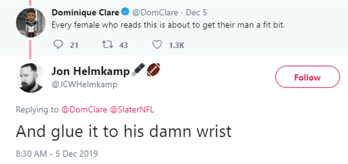 “话说有个前男友在圣诞节送了我一副Fitbit(智慧手环)当作礼物。我爱死了。我们开启了同步功能,这样我们就能激励彼此……”