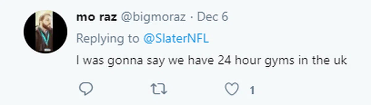 “我正想说我们在英国有24小时的健身房。”