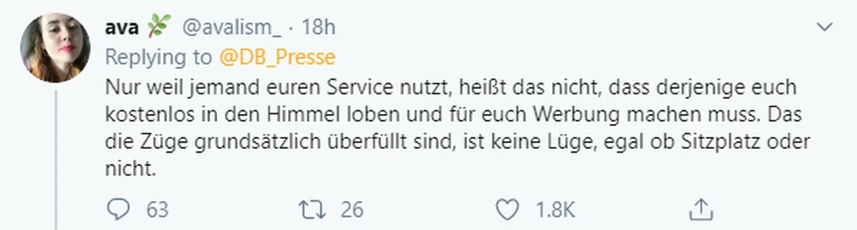 这本是一则平平无奇的推文,却被有心人解读为葛蕾塔在“抱怨”火车超载,因此才会沦落到只能坐在火车地板上的地步。也因此,这一篇似乎“话中有话”的推文引起了葛蕾塔所乘坐的火车公司德国铁路(Deutsche Bahn)的不满,在推特上掷地有声地“反击”葛蕾塔。