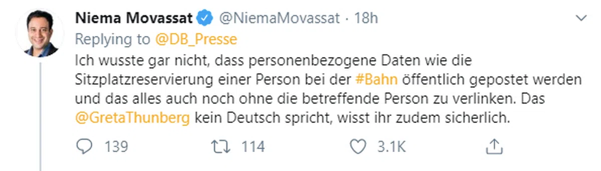 首先,有网民认为德国铁路直接公布葛蕾塔乘搭的高铁次号、出发地及目的地等,相等于泄露乘客的个人信息,这是完全不可接受的。