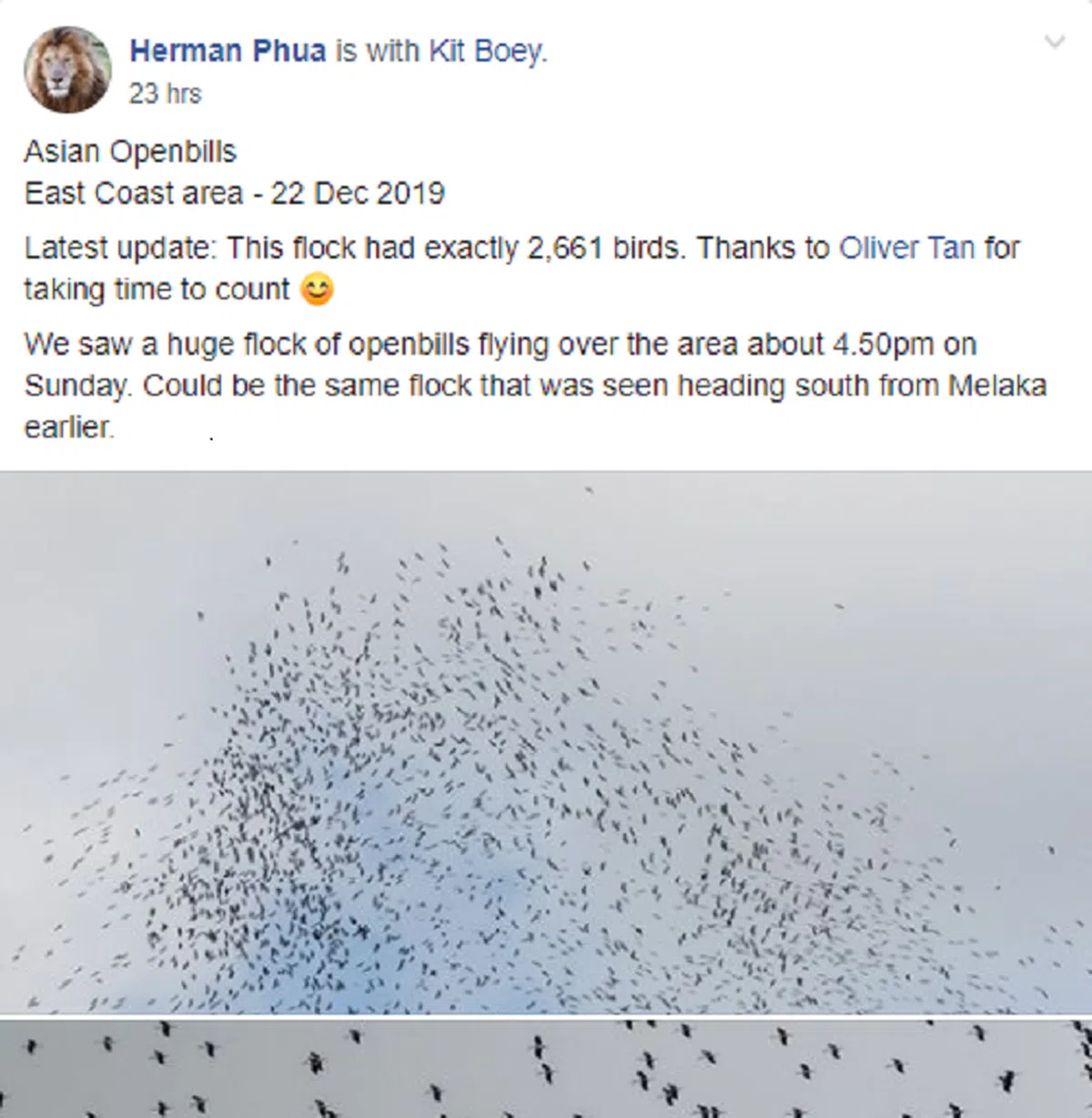 网民Herman Phua在新加坡鸟爱好者的面簿页面Bird Sighting上分享说,昨天下午4点30分在东海岸他看到了这群鸟,还拍下了照片。他的朋友还非常认真的数了一下鸟只的数量,一共2661只。