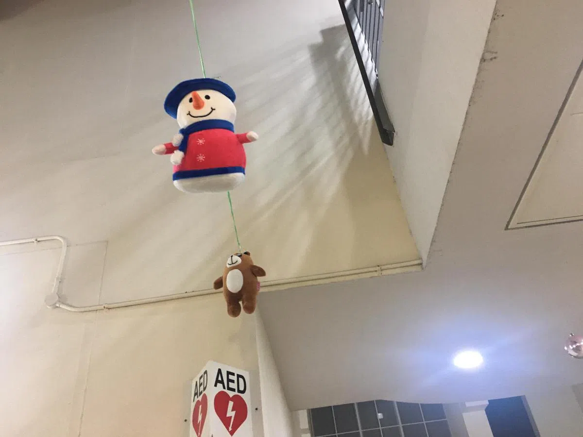 除了木屋,陈孔达也打造了小矮人和大雪人,形成强烈的对比,过后还想在组屋底层围上不同颜色的彩带,作为圣诞佳节的装饰。