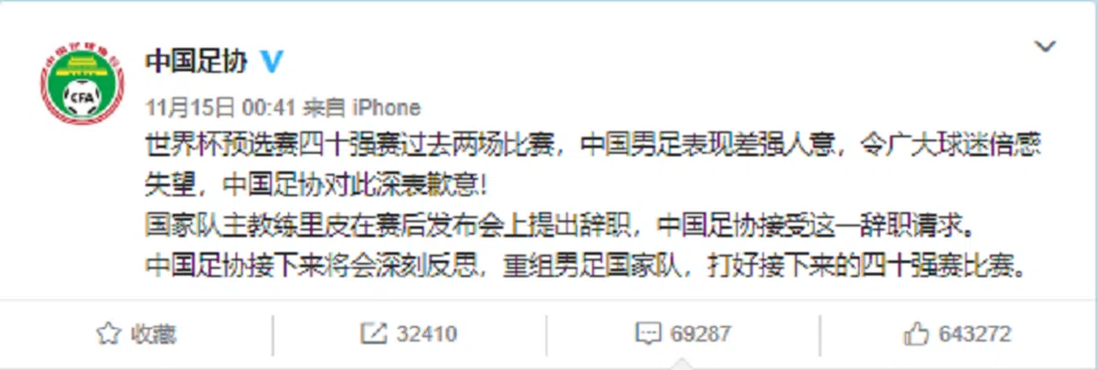 上个月14日,中国男足在世界杯预选赛中1比2不敌叙利亚队。赛后,中国足协15日凌晨通过社交媒体微博为中国男足的糟糕表现向球迷致歉: